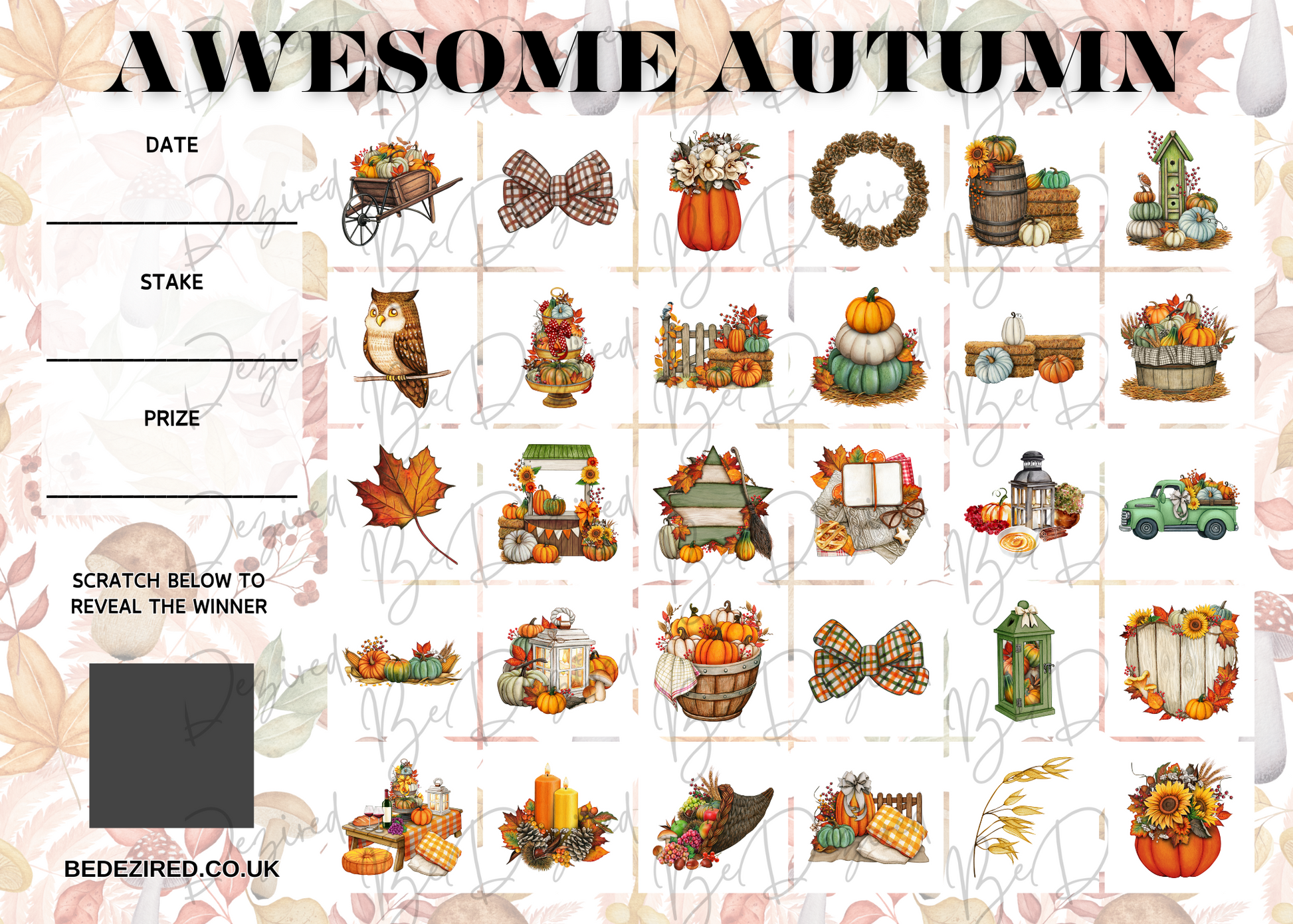 Celebrate the cosy charm of autumn with BeDezired’s seasonal scratch cards! From golden leaves and pumpkin spice to spooky surprises, our autumn-themed cards are perfect for giveaways, games, or festive fun. Designed to capture the magic of the season, each card brings a little piece of autumn joy.